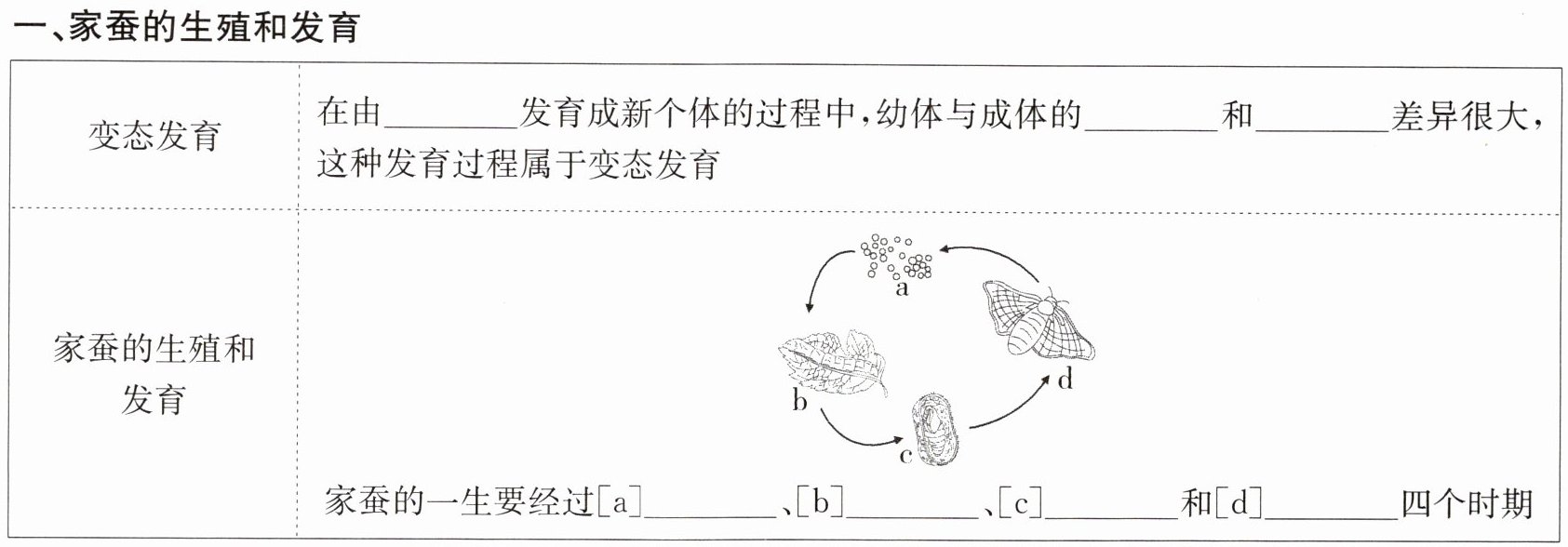 D [解析]家蚕的发育过程经历卵、幼虫、蛹和成虫四个阶段,属于完全变态发育。所以家蚕的发育过程排序正确的是[②]受精卵、[③]幼虫、[④]蛹和[①]成虫。