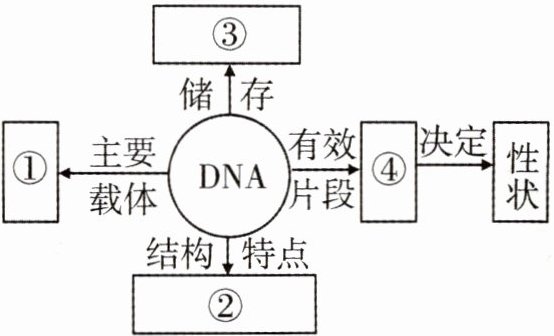 A [解析]本题考查染色体、DNA、基因和性状的关系。染色体是细胞核中能被碱性染料染成深色的物质,主要由蛋白质和 DNA 组成,DNA 具有双螺旋结构,基因是 DNA 上具有遗传效应的片段,能控制生物的性状,所以遗传信息储存在 DNA 上。