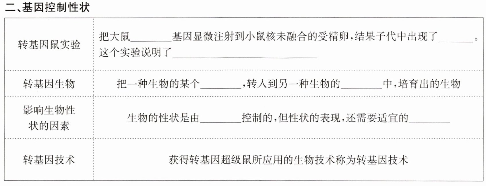 生长激素 转基因超级鼠 基因控制生物的性状 基因 基因组 基因 环境条件