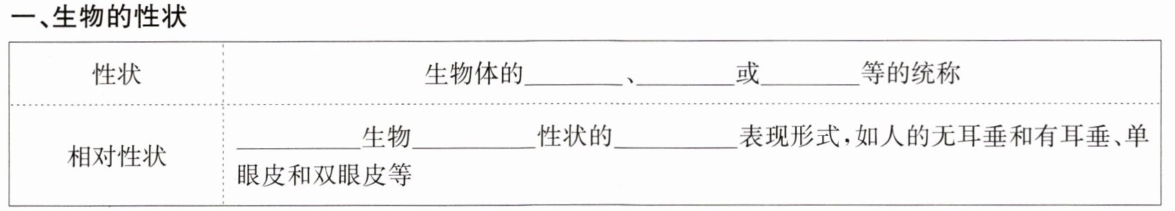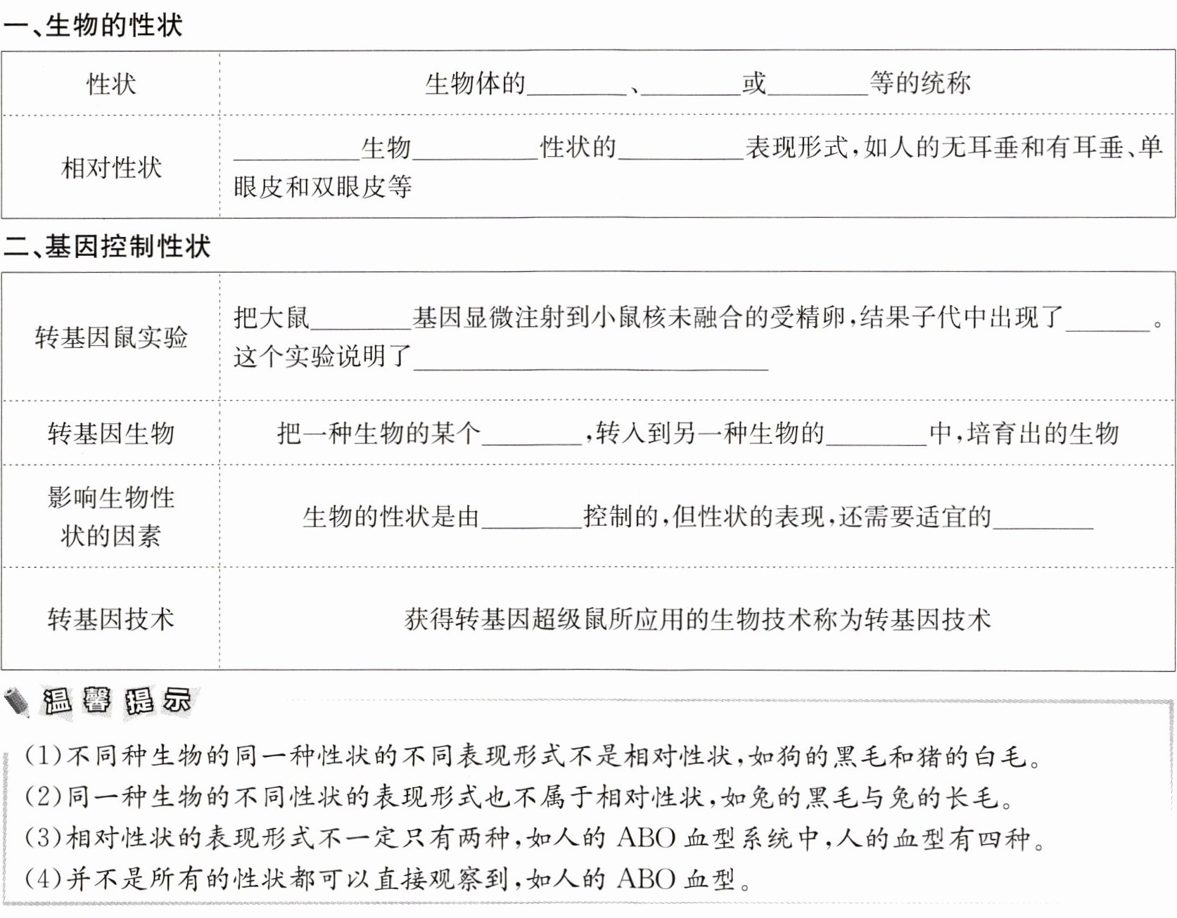 温馨提示:①有些性状通过肉眼能看到,例如苹果的形状、大小等;有些性状通过肉眼看不到,例如人的 ABO 血型等;②生物的性状是相对稳定的,一般能够遗传,受遗传物质的控制;③生物的性状也受环境的影响,是遗传物质和环境共同作用的结果。