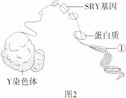 (3)观察图2,可以看出Y染色体是由蛋白质和①______组成的,其中SRY基因与①的关系是______。