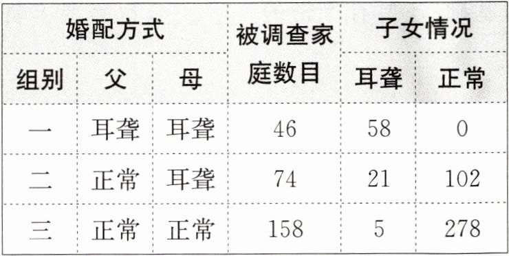 12.(聊城中考,★★☆)某研究机构对先天性耳聋(由一对基因A、a控制)遗传调查后数据如表,下列分析错误的是( )