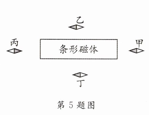 5. [广州中考]放在条形磁体周围的小磁针静止时如图所示,三个小磁针的N极和一个小磁针的S极被涂黑,则S极被涂黑的小磁针是 ( )