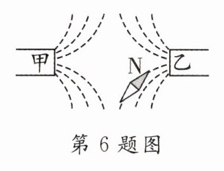 6. [金华中考]甲、乙为不同条形磁铁的两个磁极,弧线是部分未标方向的磁感线,如图所示. 根据图中小磁针静止时的指向判断甲、乙的磁极,下列描述正确的是 ( )
