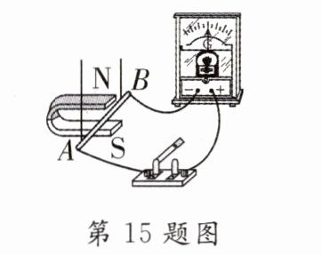 15. [2024·丽江二模改编]如图所示,这是探究“什么情况下磁可以生电”的装置. 用棉线将一段导体AB悬挂起来,置于蹄形磁体中,再与灵敏电流计连接,组成闭合电路.