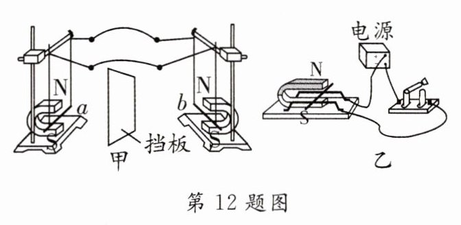 12. [2024·兰州]科技创新活动中,小雅的作品“隔板推物”引起了同学们的极大兴趣,其原理如图甲所示,a、b两个导体棒分别悬挂在两个蹄形磁铁的磁场中,两导体棒通过导线相连,构成了一个闭合回路,用手推动导体棒a左右摆动时,导体棒b会随之摆动,下列关于这一现象的说法中不正确的是 ( )