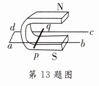 13. [2024·泸州]如图所示,ab、cd两根光滑平行金属导轨固定在同一水平面内,处于蹄形磁铁磁场中的金属杆pq放在导轨上,在外力作用下沿导轨运动. 若ad之间断开,则电路中 ______(填“有”或“无”)感应电流;若ad之间接入电流计,pq杆向右运动时,指针向右偏,pq杆向左运动时,指针将向 ______偏;若ad之间安装一个直流电源,pq杆通电后由静止开始沿导轨向右运动,同时交换电源的正负极和磁铁的南北极,pq杆通电后由静止开始沿导轨向 ______运动.