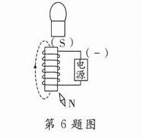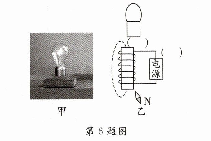6. [2024·佛山模拟]如图甲所示是桌面摆件悬空灯泡,图乙是其结构图. 小磁针靠近底座静止时如图乙所示,请在图乙中标出电源上方的极性(用“+”或“-”表示)、磁感线的方向和灯泡底部的磁极(用“N”或“S”表示).