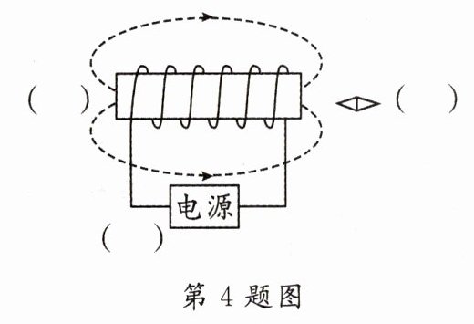 4. [2024·内江]如图所示,小磁针静止在通电螺线管右侧,请根据图中磁感线的方向,在螺线管左端和小磁针右端的括号内标出极性(“N”或“S”),在电源左边的括号内标出极性(“+”或“-”).