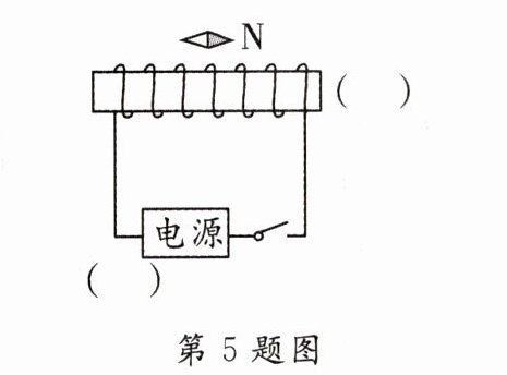 5. [2024·泰安一模]如图所示,闭合开关,请在相应括号中用“N”“S”标出通电螺线管磁极的极性,用“+”“-”标出电源的极性.