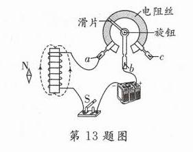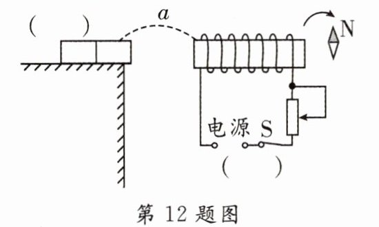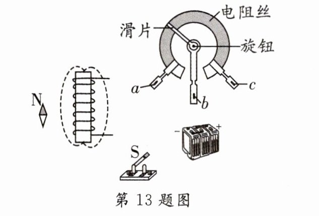 13. [2024·深圳二模]请用笔画线代替导线将图中电路连接完整,要求:闭合开关后,小磁针指向如图所示,旋钮顺时针转动时通电螺线管的磁性减弱,导线不得交叉,并标出磁感线的方向.