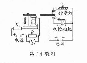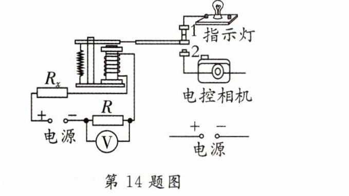 14. [2024·南阳二模]如图所示是某“汽车超载记录器”原理图,R 为保护电阻,$R_x$为压敏电阻,其阻值随压力增大而减小. 当汽车不超载时,指示灯发光;当汽车超载时,电磁铁的磁性增强,使汽车超载时照相机自动照相,请补充电路.