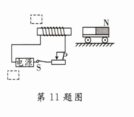 11. [2024·哈尔滨模拟]如图所示,将一条形磁体放在小车上,并靠近螺线管,闭合开关后小车向右运动,请在括号中标出通电螺线管的“N”或“S”极和电源的“+”或“-”极.