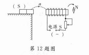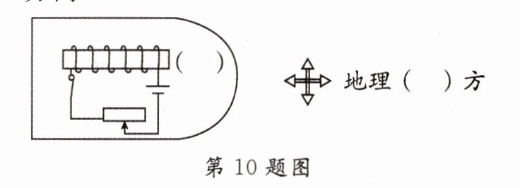 10. [2024·深圳三模]小明将自制电磁小船放在水中,闭合开关后船头(右端)在地磁场的作用下,静止时的位置如图所示. 请在图中标出电磁铁右端的磁极,以及图标中的方向.