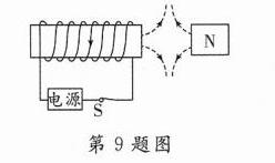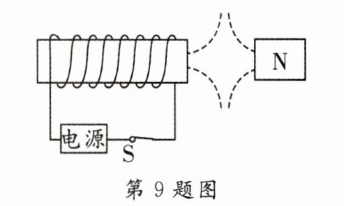 9. [2024·南充三模]闭合开关 S 后,通电螺线管与磁体磁极间的磁感线形状如图所示,请在图中用箭头标明磁感线的方向,并用箭头在线圈上标出电流方向.