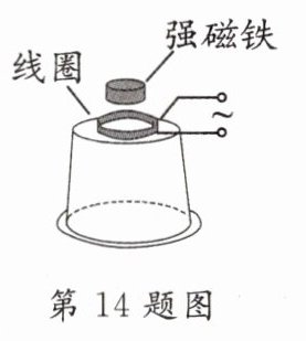 14. [2024·辽宁](多选)如图所示,某同学自制了一个扬声器,将线圈紧密粘贴在纸杯底部,在线圈上方放置一个强磁铁,在线圈中通入交变电流后,纸杯振动发声. 下列说法正确的是 ( )