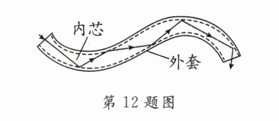12. [2024·武威模拟]光纤通信主要利用波长很________(填“短”或“长”)的激光传输信息. 如图所示,激光从光纤一端射入,在内壁上多次________,从另一端射出,把信息传到远方. 无线电广播的音频信号在发射出去之前,必须加载到频率更________(填“高”或“低”)的电信号上.