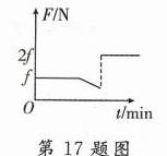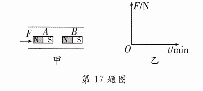 17. [2023·黔南一模]如图甲所示为俯视图:粗糙的水平桌面上,在同一直线上相距较远地放置两个条形磁体A、B. 先在A上施加水平力F使其沿直线向磁体B运动,假设当A运动一段时间后,两磁体间才出现吸引力,直至它们吸在一起后共同向右运动一段时间. 若整个过程保持A做匀速直线运动. 请在图乙中画出在上述过程中作用于磁体A上的力F其大小随时间t变化关系的大致图象.(只需画出一种可能的情况).