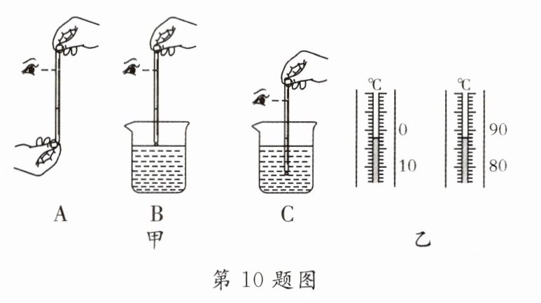10. [茂名中考]使用温度计时,首先要观察它的_______和认清它的分度值. 小明用温度计测量烧杯中液体的温度,分别进行了三次操作,如图甲所示,其中正确的操作是______. 如图乙所示是用温度计分别测得的冰和水的温度,那么冰的温度是______$^{\circ}C$,水的温度是_______$^{\circ}C$.