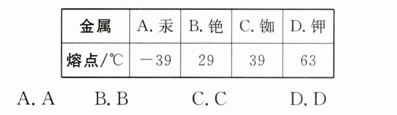 9. [2024·深圳三模]有一种金属存放在 30 ℃的煤油中时是固态,当煤油温度变为 45 ℃后,它逐渐熔化,该金属可能是 ( )
