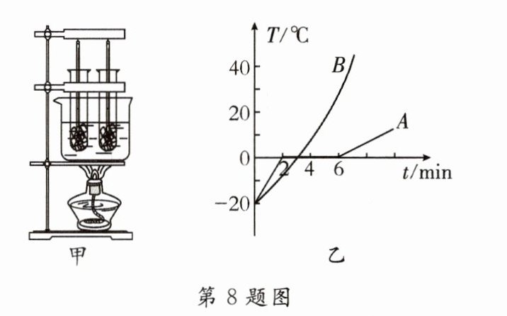 8. [苏州中考]如图甲所示,将质量相等的冰和蜡烛分别装在两个相同的试管中,放入装有水的烧杯中加热(不考虑热量散失). 绘制出温度随时间变化的图象如图乙所示. 下列说法正确的是 ( )