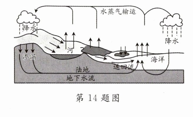 14 [ [德阳中考]如图所示是地球上的水循环示意图,请你用态态变化知识简单描述水循环的过程.