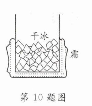 10. 把干冰(固态二氧化碳)放入铝罐里一段时间,罐外壁结了一层霜,如图所示,这层霜是由________经过________形成的. 寒冬,坐满人的汽车门窗紧闭,水蒸气液化成小水珠附着在玻璃车窗上,水蒸气变成水珠________(填“会吸热”“会放热”或“不会吸热和放热”),水珠会出现在车窗的________(填“内侧”“外侧”或“内、外侧”).