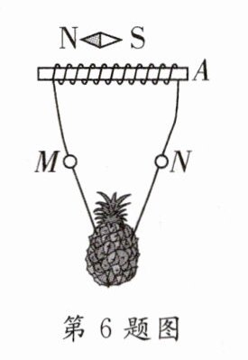 6. [2023·洪洞期末]科技小组的同学将不同金属丝插入菠萝中自制了水果电池,然后将一根导线在纸筒 A 上绕制成螺线管,导线两端接在水果电池两极上,螺线管产生的磁场使小磁针静止在如图所示状态. 下列判断正确的是 ( )
