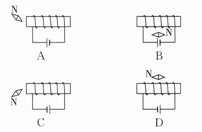 B 解析:A. 小磁针的左端为 S 极,根据磁极间的相互作用可知,通电螺线管的右端为 N 极,故 A 错误;B. 小磁针的作用是指示通电螺线管周围的磁场方向,其静止时 N 极所指方向就是该点的磁场方向,故 B 正确;C. 由于通电螺线管周围的磁场方向可能相同也有可能不同,因此将小磁针移到其他位置,N 极所指方向不一定不变,故 C 错误;D. 实验中,当改变电路电流方向时,螺线管两端的极性改变,小磁针静止时 N 极的指向也会发生改变,可知,通电螺线管的磁极与电流方向有关,故 D 错误. 故选 B.