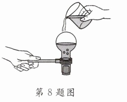 8. [2024·河源二模]小明在进行“探究水沸腾时温度变化的特点”实验时发现,当烧瓶内的水沸腾时停止加热,一段时间后水也停止沸腾,这说明水沸腾时需要__________;如图所示,用橡皮塞塞住烧瓶口后将其倒置,向烧瓶浇冷水,烧瓶中的水又重新沸腾起来,原因是____________________.