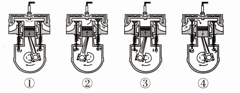 6. [2024·临沂]2024年4月20日,我国研制的全球首款本体热效率达53.09%的柴油机正式亮相世界内燃机大会,刷新了柴油机热效率的世界纪录. 如图所示内燃机的四个冲程,汽缸内气体的内能最小的是 ( )