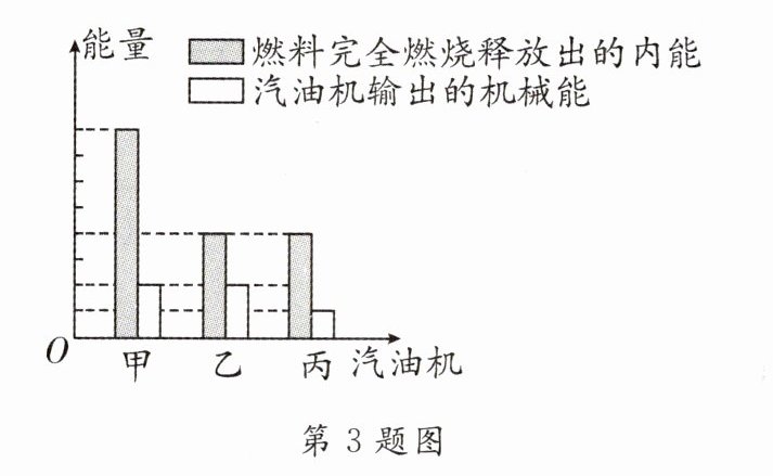 3. [2024·广州三模]如图所示显示的是甲、乙、丙三台汽油机的参数. 甲、乙、丙相比,正确的是 ( )