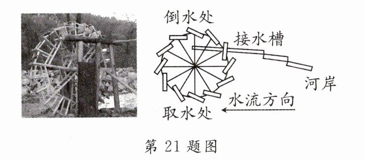 21. 《天工开物》是我国古代的科学著作,其中这样写道:“凡河滨有制筒车者,堰陂障流,绕于车下,激轮使转,挽水入筒,一一倾于枧内,流入亩中. 昼夜不息,百亩无忧. ”该段文字描述了筒车这样一种以水流作动力,用来取水的机械,如图所示.
