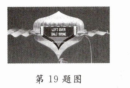 19. 如图所示为一款创意节能灯. 将海水存放到中间的容器,然后利用太阳光照射升温,使海水的内能________,海水蒸发后由侧壁回流到淡水收集装置中. 蒸发后残留的盐水会与内置的铜、锌电极板发生化学反应,使LED灯发光,该装置发电过程将________能转化为________能,再由LED灯转化为光能.
