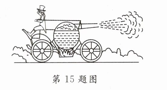 15. 如图所示是世界上早期蒸汽汽车的模型,蒸汽汽车中的燃料燃烧将化学能转化为水和水蒸气的________,再转化为汽车的________能,使汽车前进.