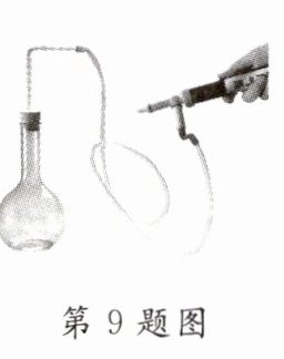 9. [绵阳中考]如图所示,用塞子塞紧瓶口,再用打气筒向瓶内打气,当瓶内气压达到足够大时,塞子从瓶口冲出. 下列关于瓶内气体的说法,正确的是 ( )
