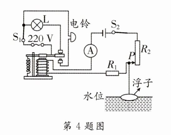 4. [2024·渭南模拟]为了应对即将到来的汛期,某课外兴趣小组设计了一个检测水库水位的装置,其原理如图所示. L 为安全指示灯,电铃为报警器,R₁ 为定值电阻,R₂ 为竖直放置、粗细均匀且足够长的电阻棒,滑片 P 可以在电阻棒上自由滑动,并与浮子用竖直的绝缘杆连接,可随着浮子的上下移动而改变电阻棒 R₂ 接入电路的阻值,从而可通过电流表的示数来反映水位的高低. 当滑片 P 指向 R₂ 的中点时,水位达到警戒值,电磁铁吸下衔铁报警. 则该检测器正常工作时( )