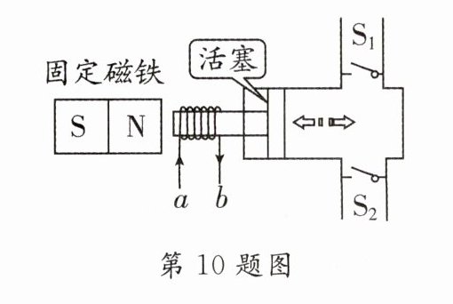 10. [2024·成都模拟]现在医学上使用的心肺机的功能之一是用“电动泵”替代心脏,推动血液循环. 如图所示,当线圈中的电流从 a 流向 b 时,此时活塞将向________运动,促使血液流动. 调节通过电磁铁的电流大小,还可以实现磁场________的变化.