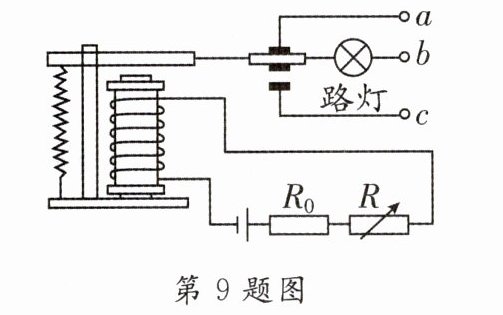 9. [2023·自贡]如图所示,R₀ 是一个光敏电阻,光敏电阻的阻值随光照强度的增加而减小. R 是电阻箱(已调至合适阻值),它们和继电器组成自动控制电路来控制路灯,白天路灯熄灭,夜晚路灯亮起. 下列说法正确的是( )