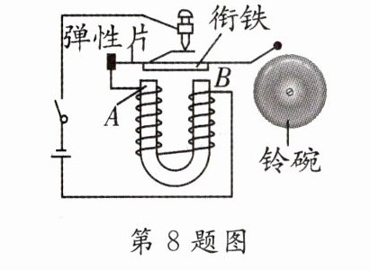 8. [2024·亳州二模]如图所示,闭合开关,当电流通过电磁铁,小锤击打铃碗时,电磁铁________(填“仍具有”或“没有”)磁性.