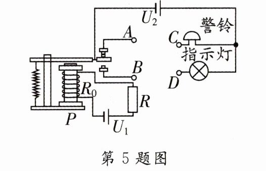 5. [2024·沅江二模]小明利用热敏电阻设计了一个过热自动报警电路,如图所示. 将热敏电阻 R 安装在需要探测温度的地方,当环境温度正常时,继电器衔铁与上触点接触,下触点分离,指示灯亮;当环境温度超过某一值时,继电器衔铁与下触点接触,上触点分离,警铃响. 图中热敏电阻 R 的阻值随温度升高而降低,继电器线圈用漆包线绕成,阻值恒为 R₀. 下列说法正确的是( )
