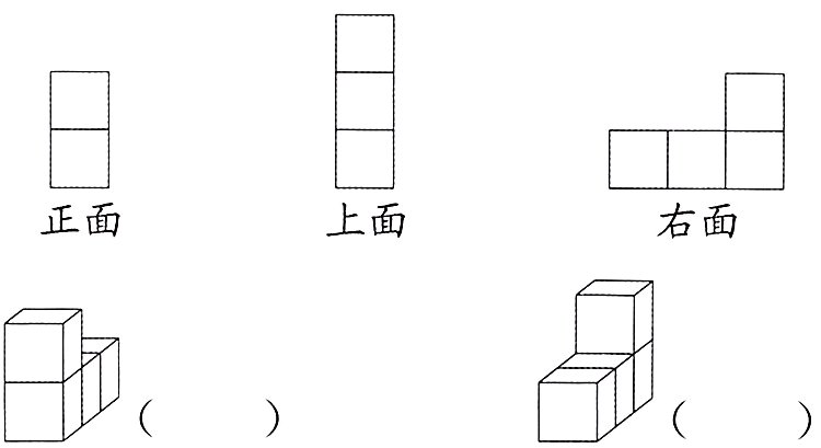 用4个相同的正方体搭立体图形,从不同方向看到的形状如下。在正确的立体图形后面画“√”。