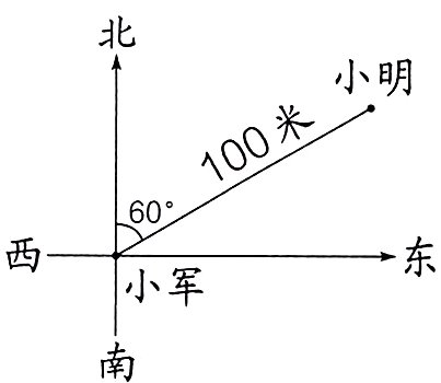 如图,如果以小军为观测点,那么小明在小军的北偏东60°方向100米处;如果以小明为观测点,那么小军在小明的( )偏( )( )°方向( )米处。