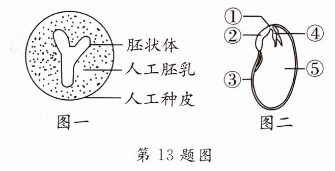 13.[2023·呼伦贝尔]科学家将某些植物细胞如嫩茎切成的碎片培育成胚状体,再用营养物质和其他必要成分将其包裹起来,制成人工种子,可直接在田间播种,萌发成幼苗。如图一、图二分别为人工种子和菜豆种子模式图,有关分析错误的是 ( )
