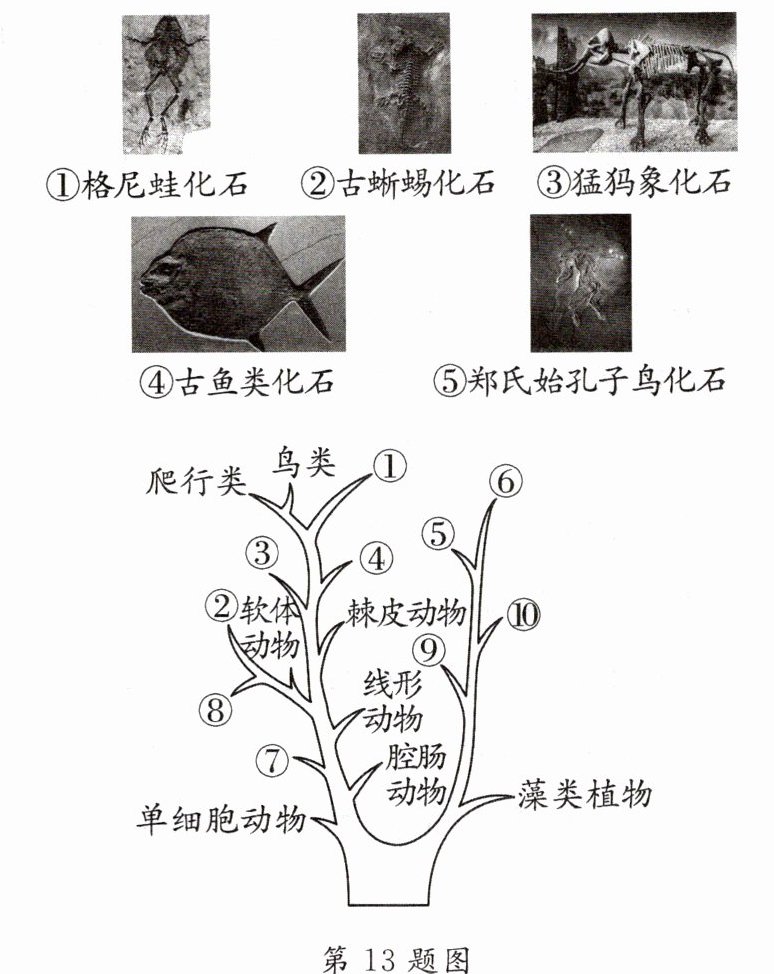 13. 凡凡和几位同学对生物进化历程产生了浓厚的兴趣。凡凡同学仿照课本绘制了的生物进化树(如图)。周末同学们参观了中国古动物博物馆,被各种各样神奇的化石深深吸引,并将部分化石进行了拍照,请你观察、分析、比较,结合所学知识回答下列问题。