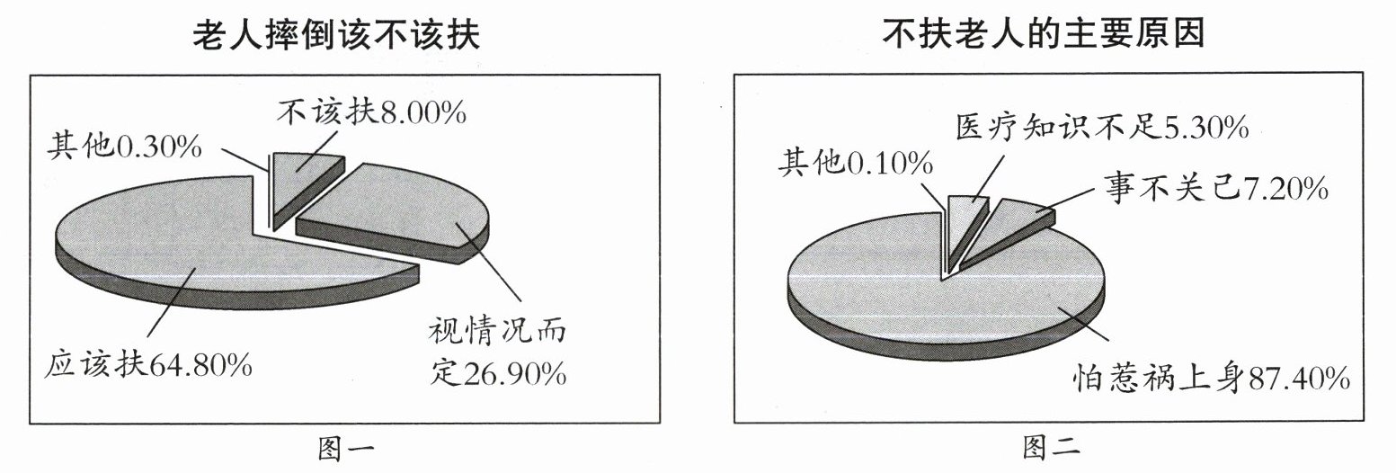 近年来,“老人摔倒该不该扶”成了公众谈论的热点话题。某大学生进行了“关于社会道德和信任问题”的调查,下列为相关调查数据图。
