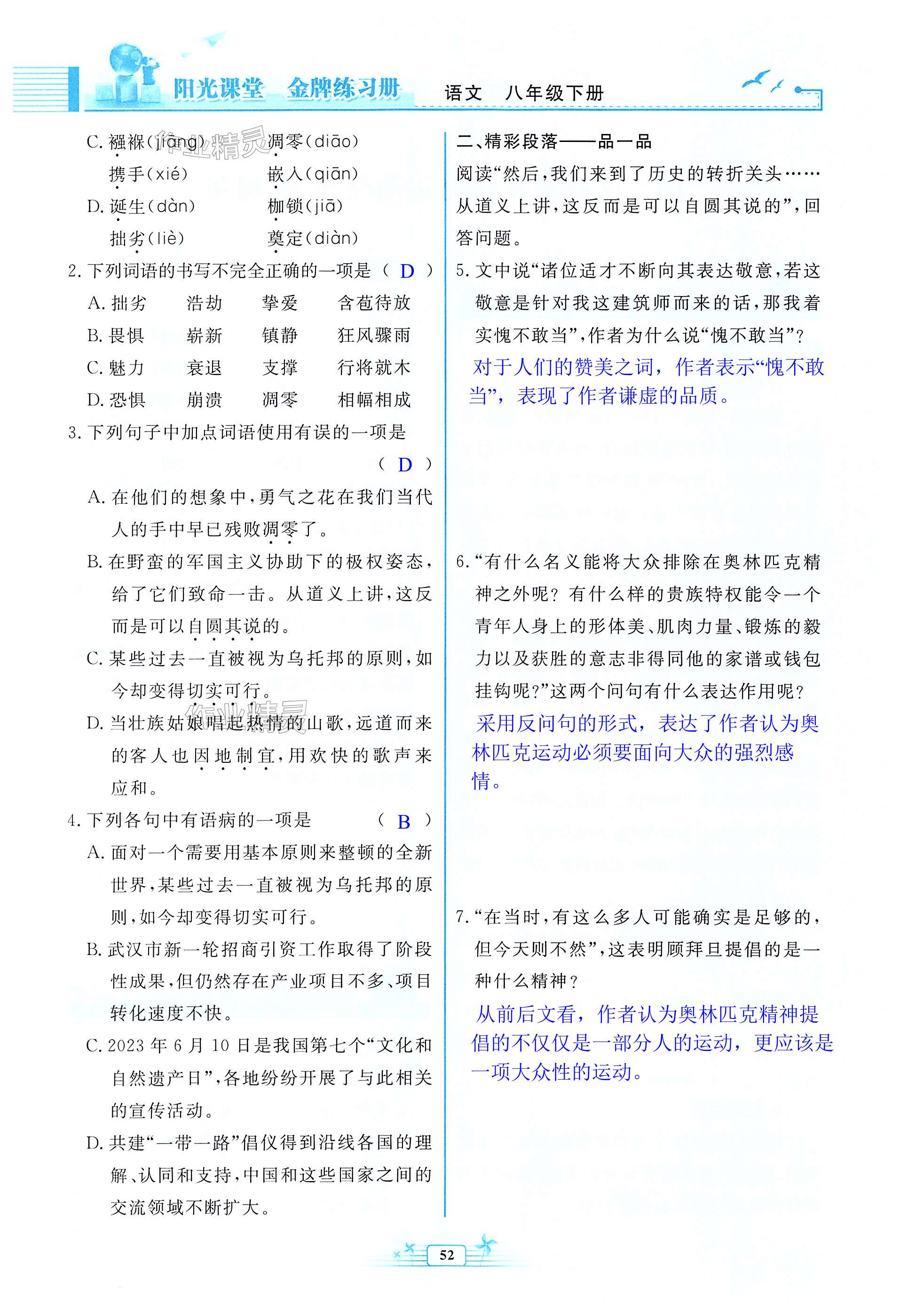 注:目前有些书本章节名称可能整理的还不是很完善,但都是按照顺序排列的,请同学们按照顺序仔细查找。练习册 2025年阳光课堂金牌练习册八年级语文下册人教版 答案主要是用来给同学们做完题方便对答案用的,请勿直接抄袭。