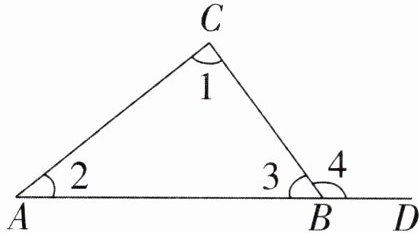 3. 把三角形$ABC$的边$AB$延长到点$D$(如图),形成了一些角。下面关于$\angle4$的推理判定中正确的是( )。