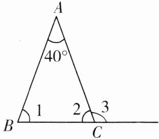 1. 已知下图中等腰三角形$ABC$的顶角是$40^{\circ}$,求$\angle3$的度数。(写出必要的过程)
