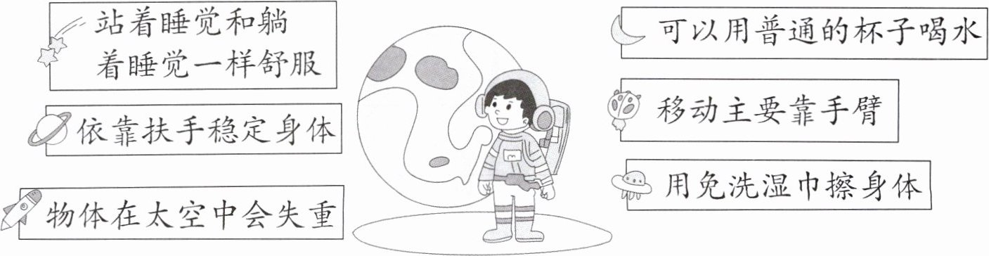 四、下列关于太空生活的说法,哪些是正确的?把正确的说法和航天员连起来。
